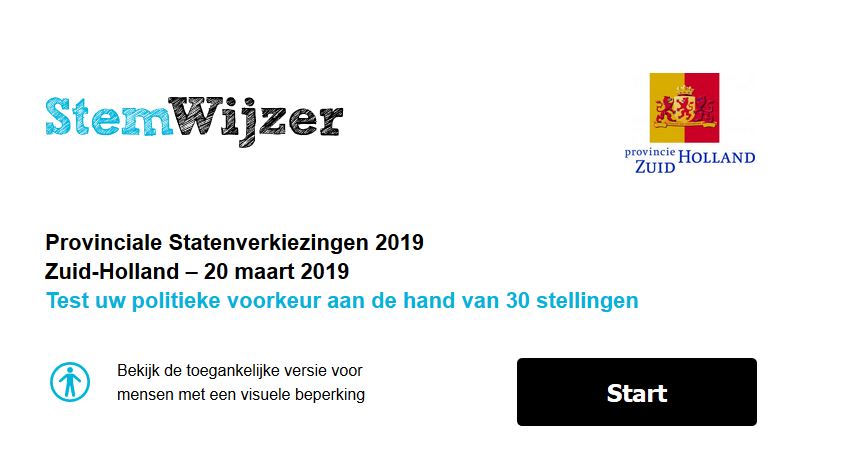 Voor de Provinciale Statenverkiezingen 2019 is ook weer een Stemwijzer gemaakt. Daar kunt u uw politieke voorkeur aan de hand van 30 stellingen testen. Als u op onderstaande afbeelding klikt gaat u naar de website van Stemwijzer.